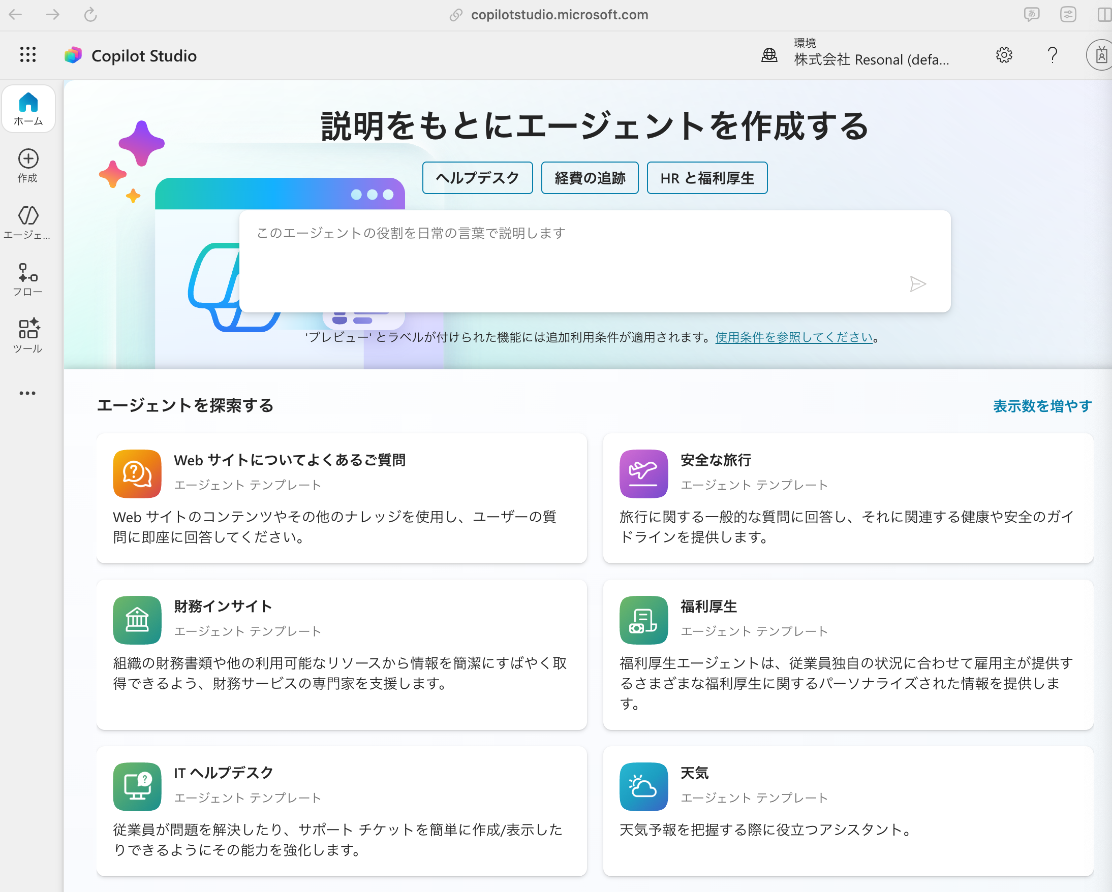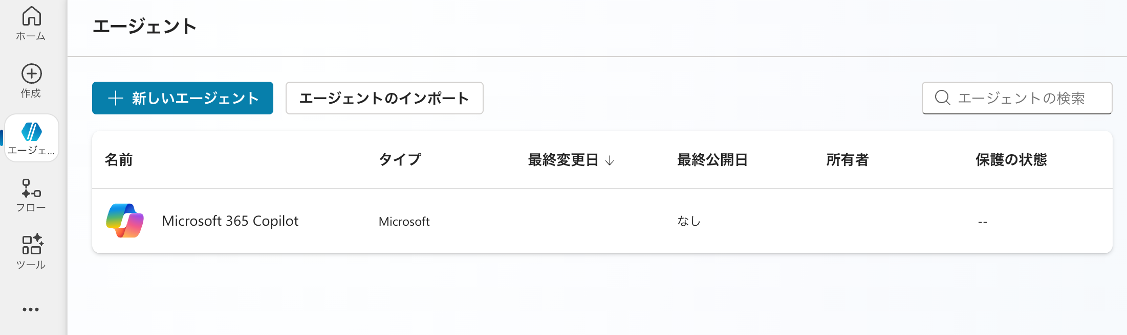それではエージェントの作成を行なっていきます。今回はエージェントの作成・公開・設置をゴールとするため、上位の概念であるソリューションやPower Platformの解説はいたしません。より実践的なエージェントの作成方法として後日別の記事にて公開する予定です。