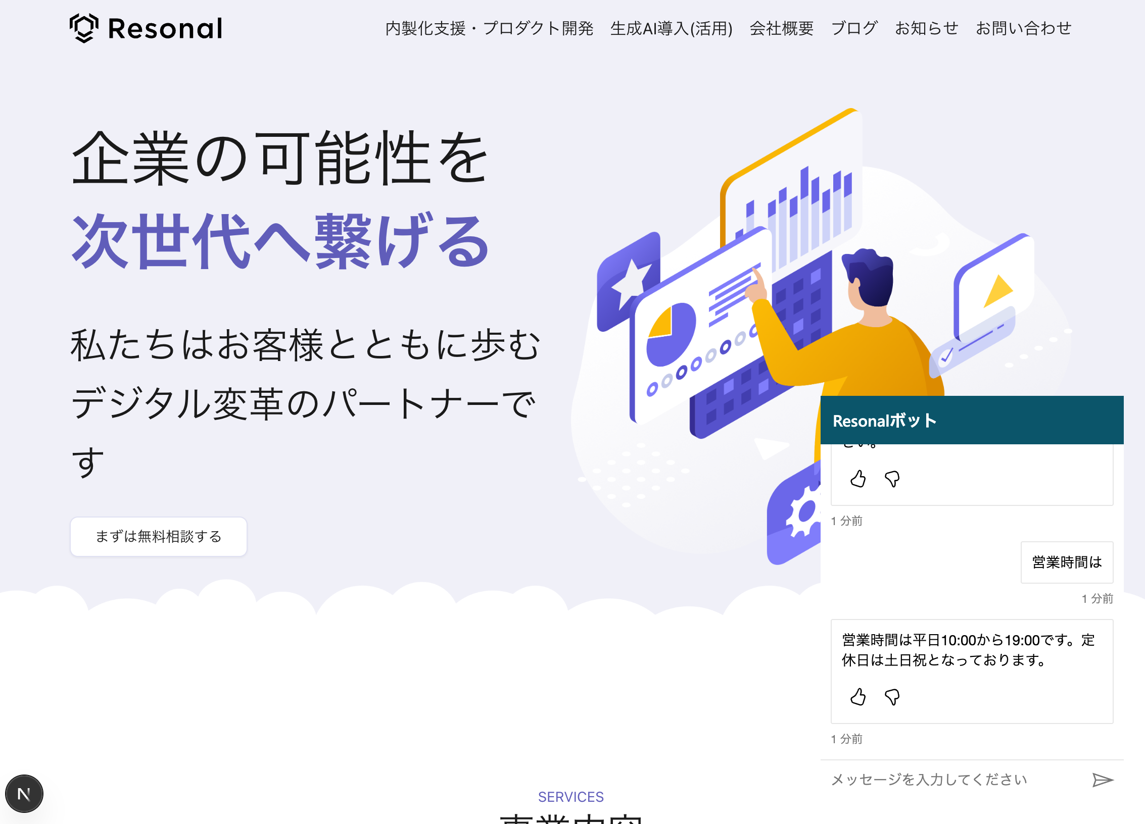 }細かい表示の制御や、デザインの変更は行なってませんが、画面の右側にエージェントを有したBotが設置されました。設定したトピックの「営業時間」に関する話題も正常に返信がされ正常に動作しています。