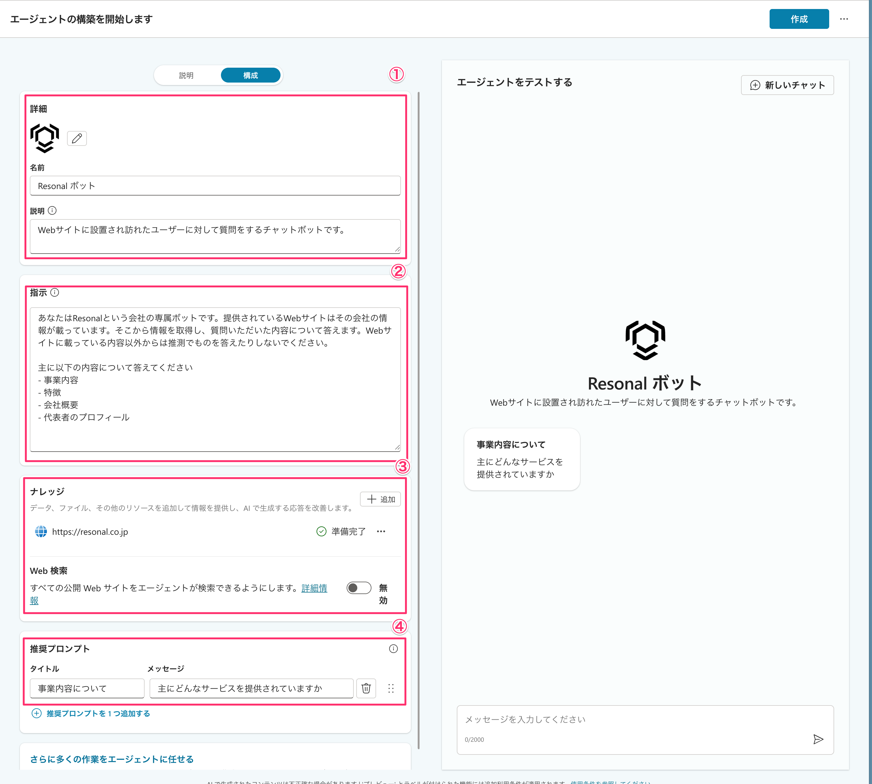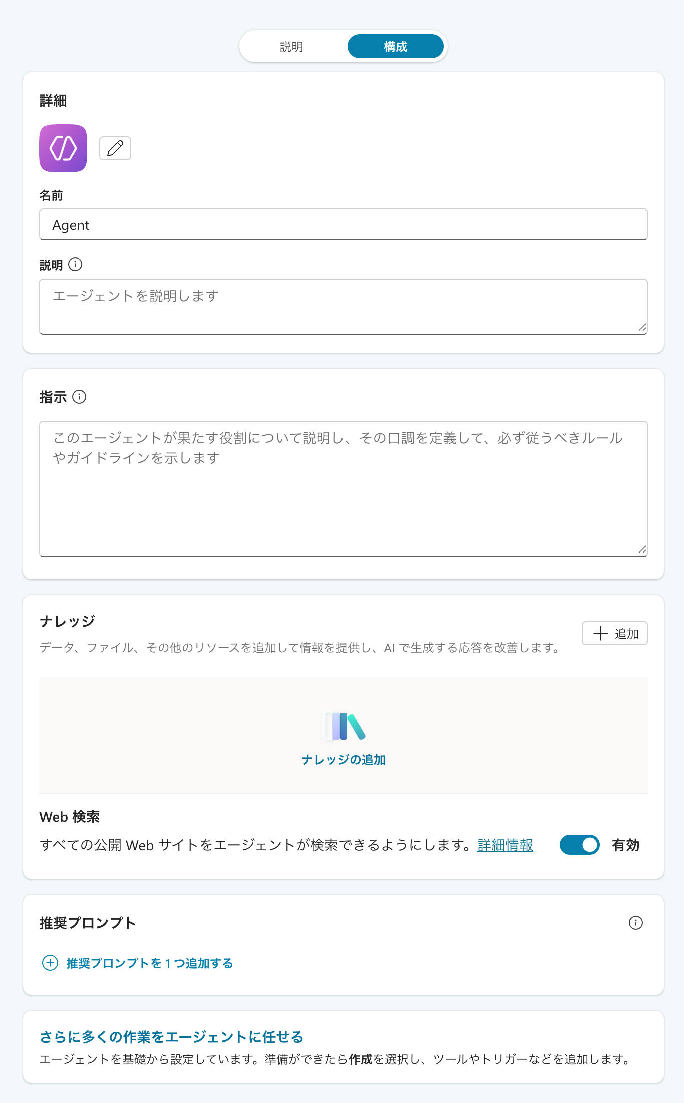 基本情報としてアイコンやエージェントの名前、説明を設定します。