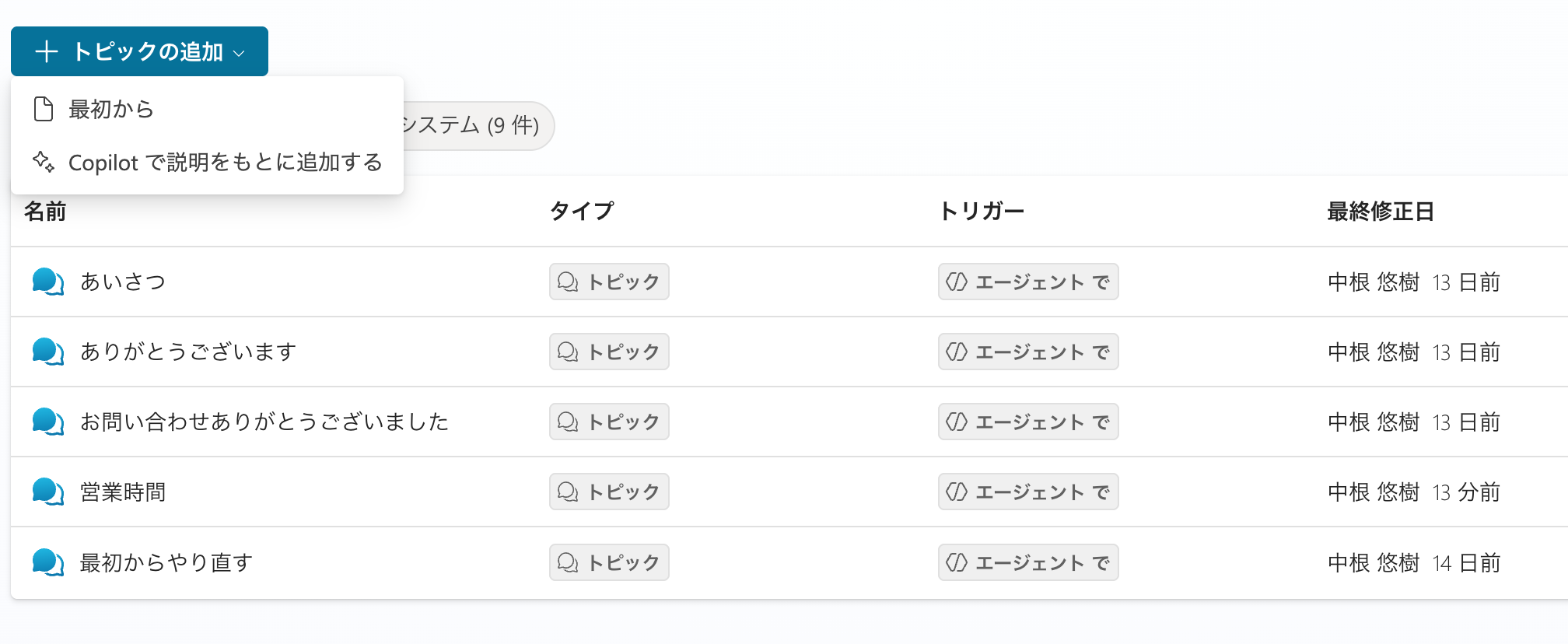 名前のとおり、エージェントがトピックを実行する際の起点のアクションとなります。ユーザーの特定の入力を契機としたり、特定の動作の終了時などさまざまなタイミングでの実行が可能です。今回は「エージェントが選択するもの」を選択しており、エージェントがトピックの昨日の説明を読み取って、役割と使用するタイミングを理解します。