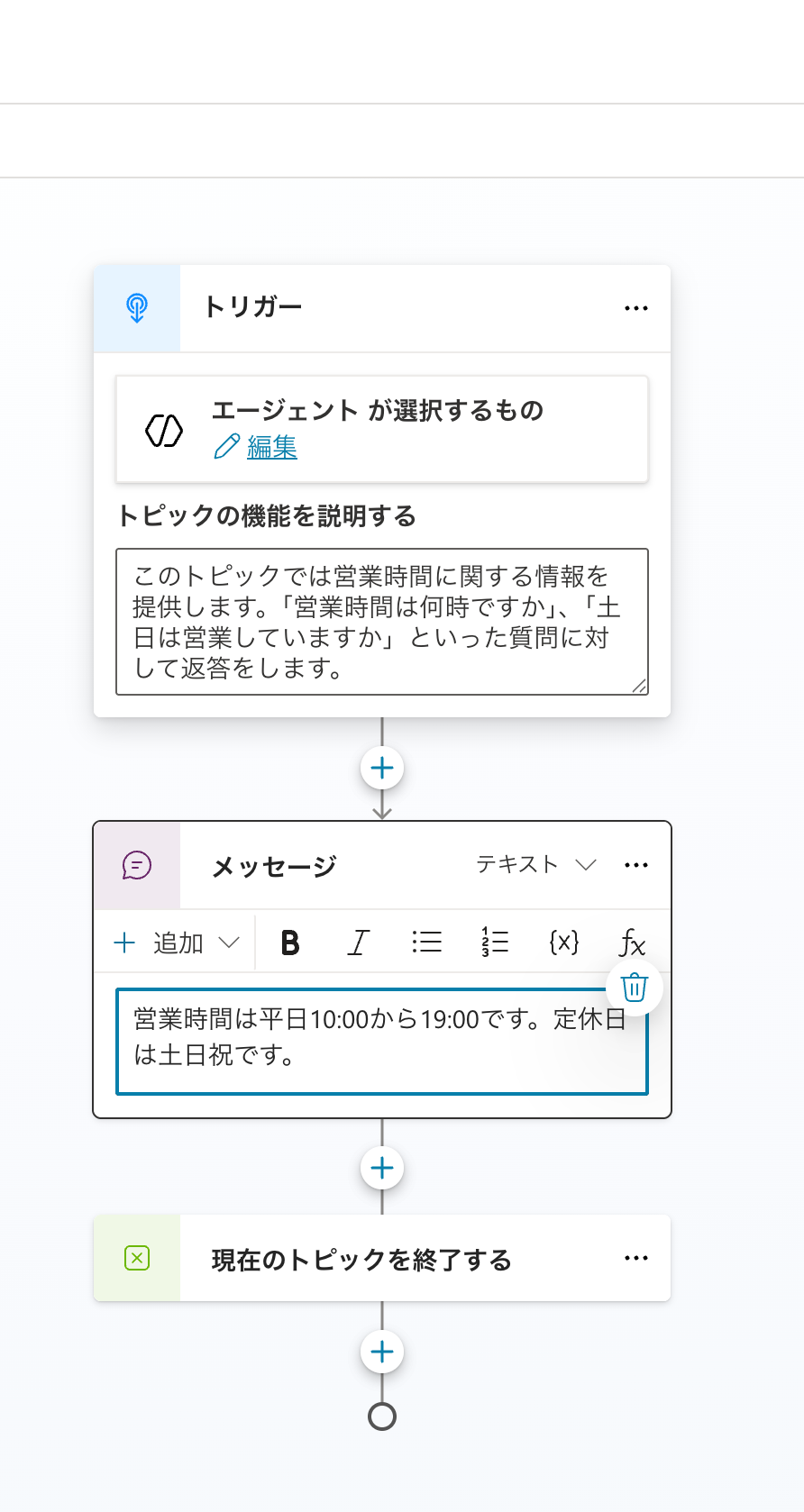 今回は「メッセージ」を選択しています。トピックの機能の説明に応じて、メッセージの内容をエージェントから返信します。今回は、「営業時間」に関する話題をユーザーが入力すると、営業時間や定休日に関しての返信をするようになっています。その他にも、質問を返したり、別のトピックを実行したり、条件分岐をさせたりと、さまざまなアクションをとることが可能です。そして最後にこのトピックを終了しています。