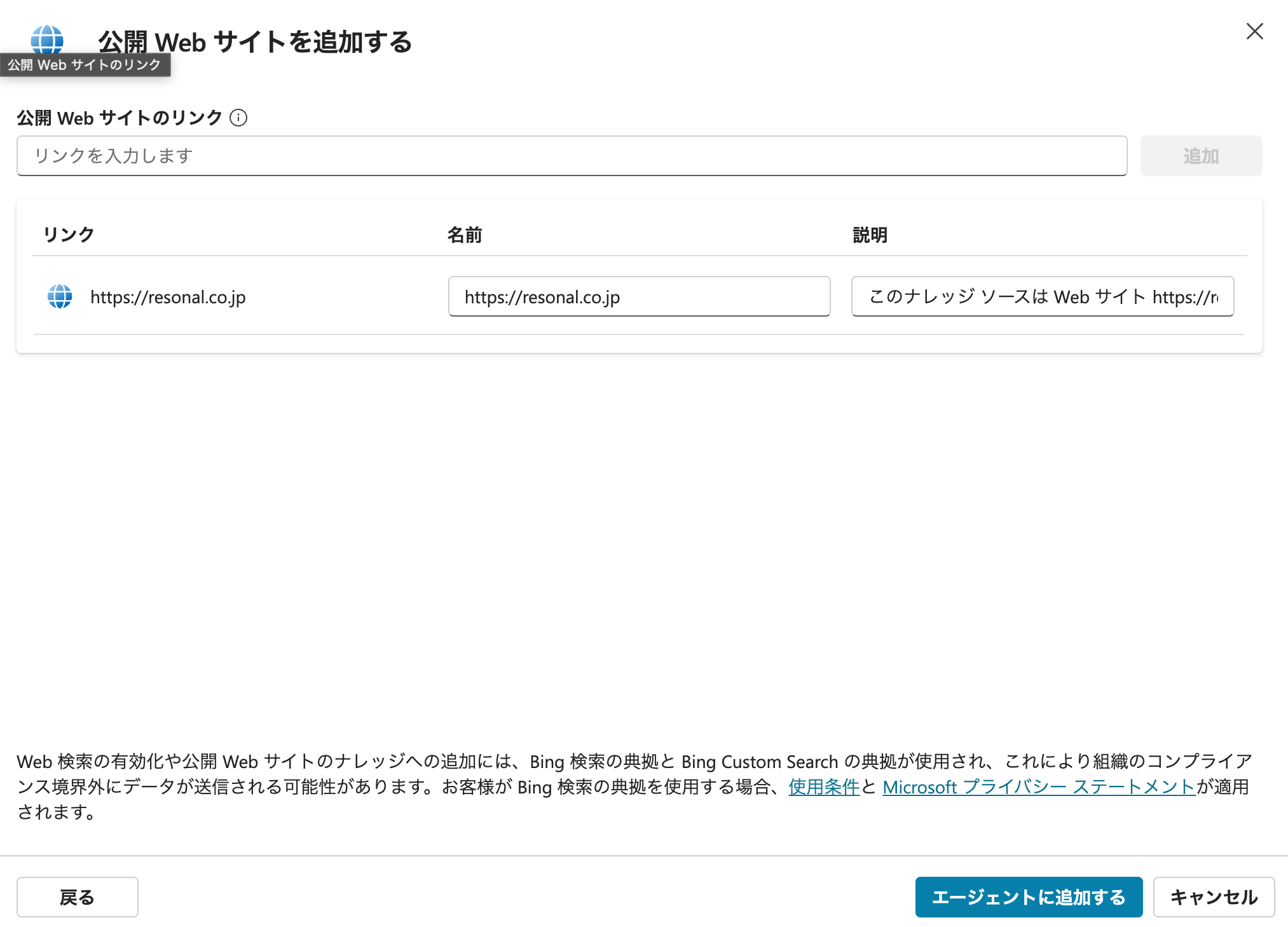 リンクに自社のウェブサイトURLを入力しました。エージェントに追加するを選択します。