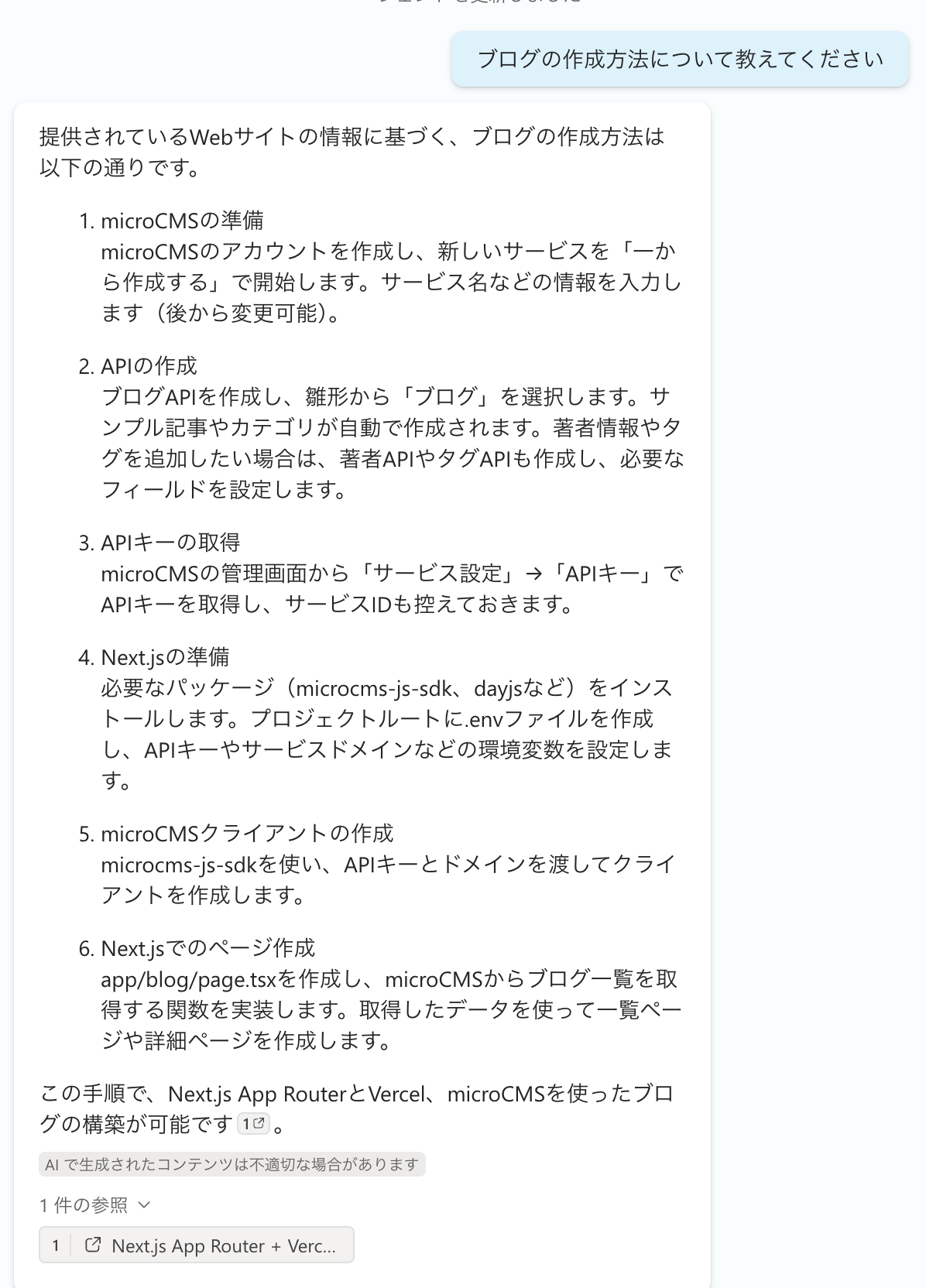 次に、下層のページであるブログページから情報を取得できないか試します。以前に書いたこのブログの作成についての記事があるので、「ブログの作成方法について教えてください」と入力します。