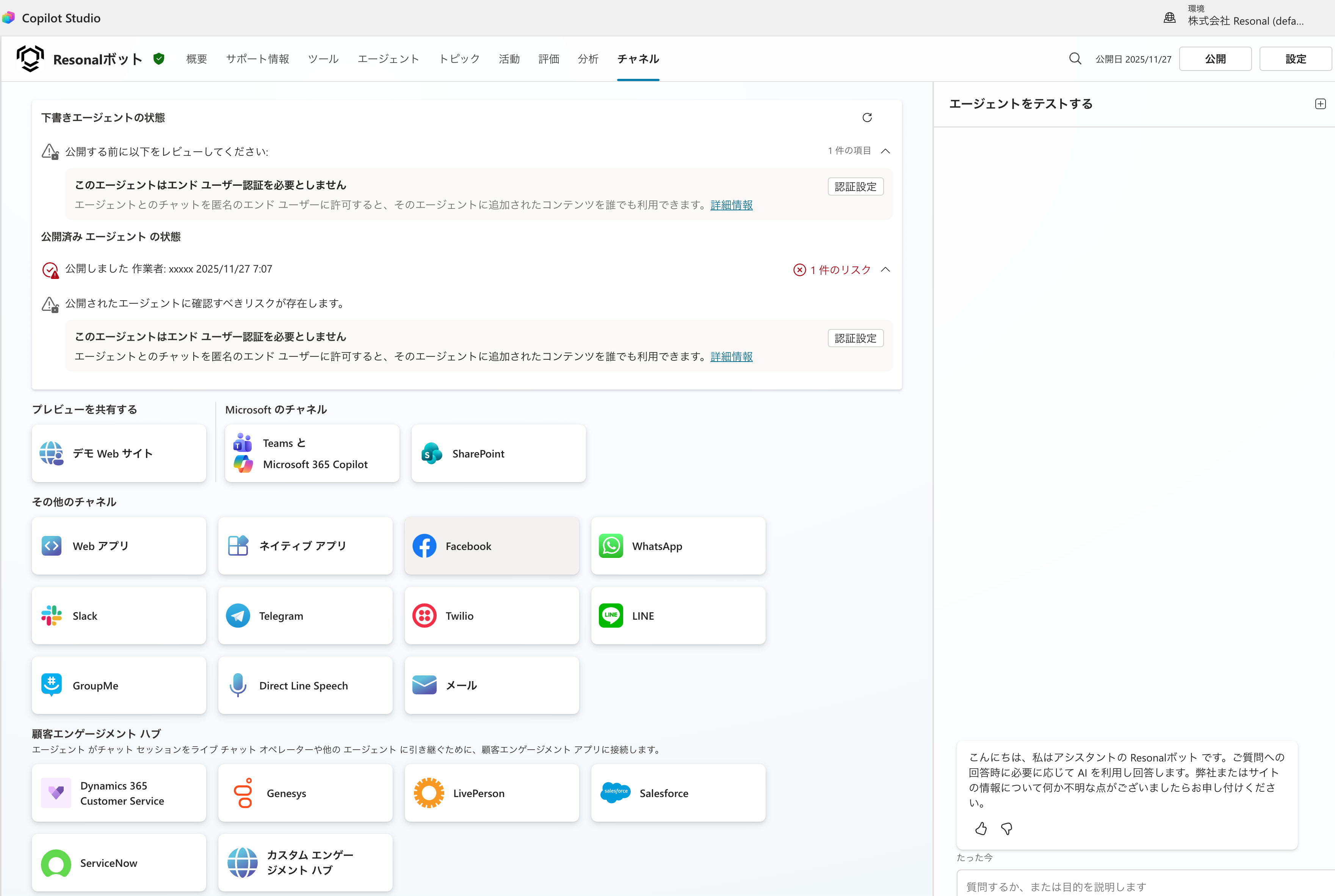 エージェントはさまざまなところに公開することが可能です。まず、画面右上の公開ボタンから公開します。今回のケースでは自社のWebサイトを想定しているので、MS365の認証を必要とさせず、認証なしでユーザーがこのBotを使えるようにしています。認証の設定はメニューのセキュリティから選択できます。一点、注意点ですが、Copilot Studio Userの権限を持っていないと公開することができません。別の記事にて公開予定ですが、MS365の管理センターから必ず該当の権限を付与してください。