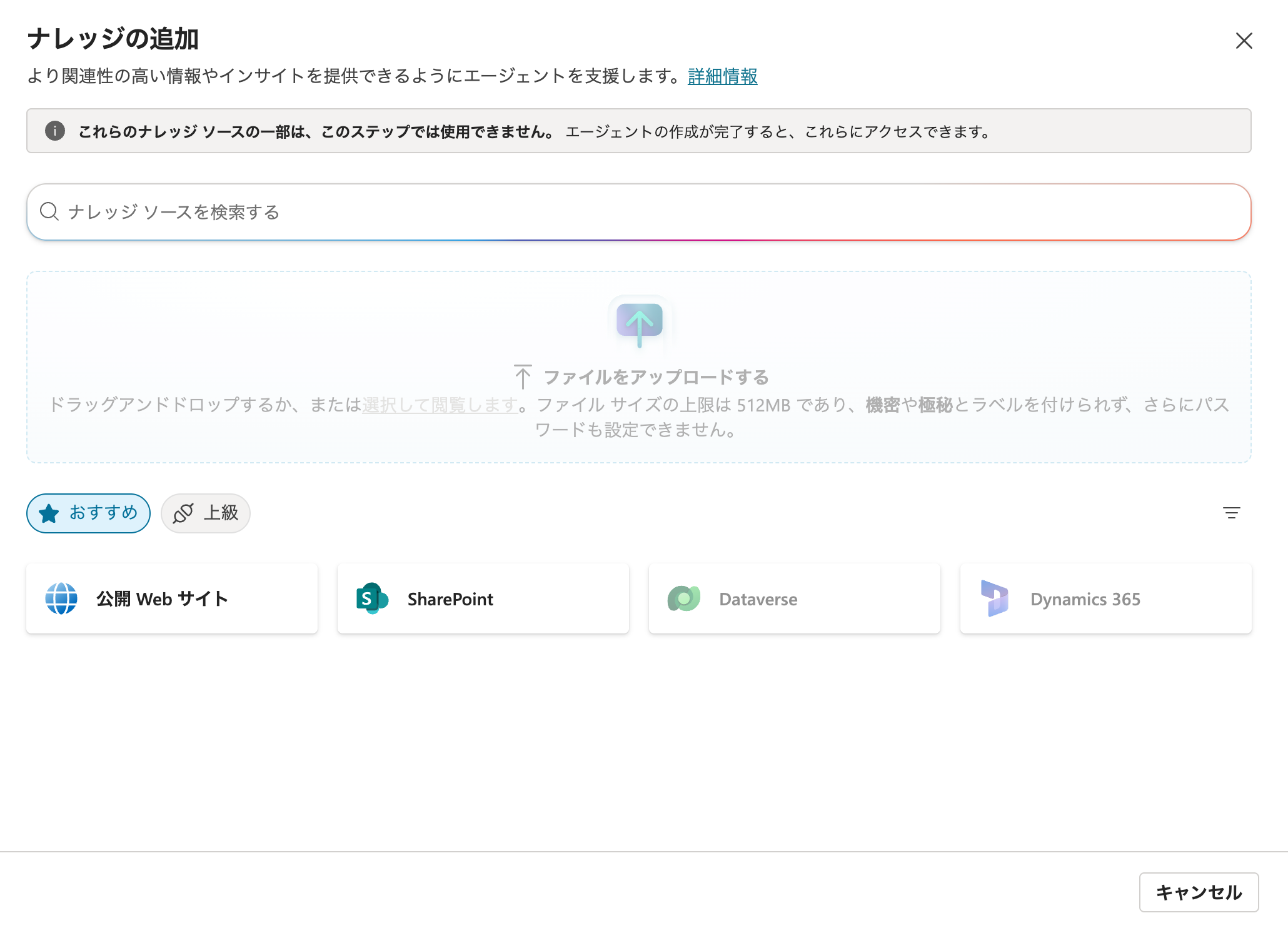 公開WebサイトやSharePointなどを指定することができます。例えばSharePointで社内のITヘルプデスクが作られている場合、そちらをナレッジとして読み込ませることで、社内向けのITヘルプデスクボットなどを作成することも可能です。なおDataverseやファイルのアップロードに関してはエージェント作成後でないとナレッジとして追加することができません。