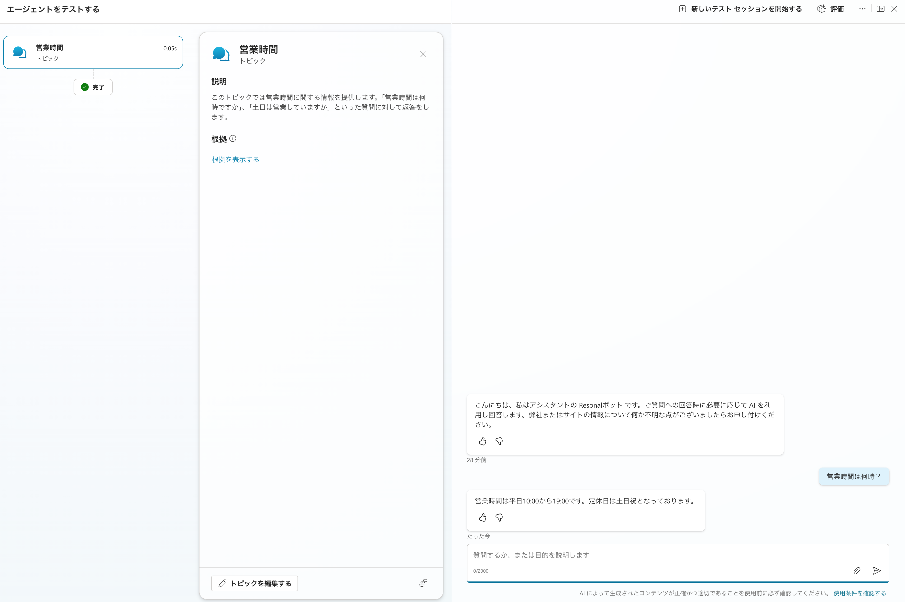 最後にトピックのテストをします。画面右側でいつでもテストをすることが可能なので、「営業時間は何時?」とエージェントに質問してみます。すると先ほど設定したメッセージがユーザーに対して返されることが確認できます。