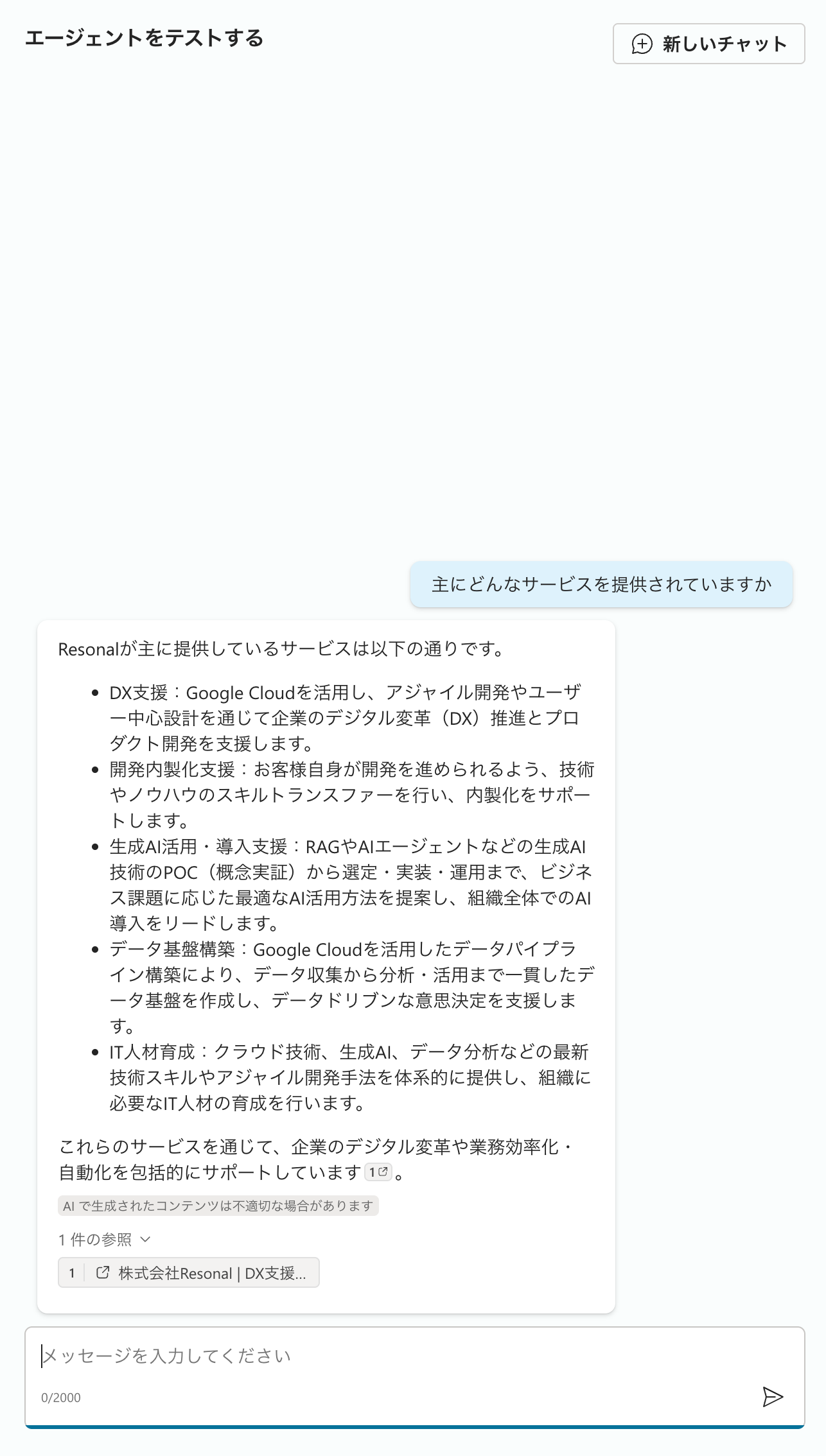 こちらはサンプルとなるプロンプトを設置することが可能です。例えばWebサイトに設置する場合、よくある質問についてプロンプトとして載せておくといいかもしれません。今回は自社のサービスについて「主にどんなサービスを提供されていますか」というプロンプトを設置しました。