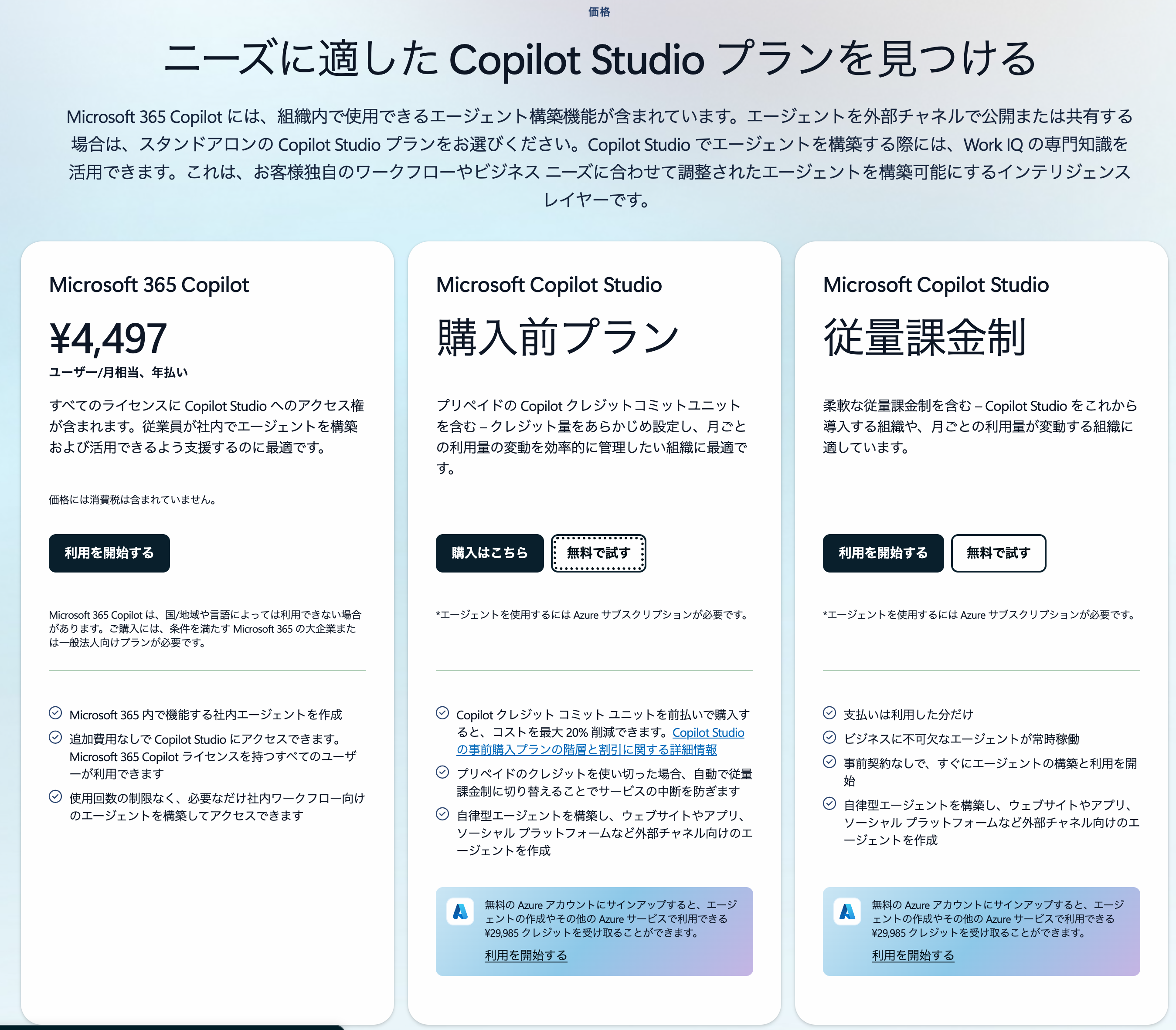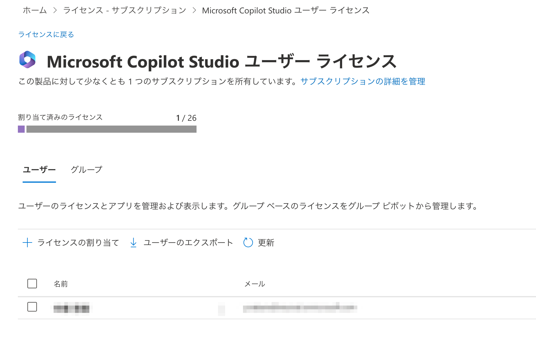 従量課金の設定ができているはずなのに、エージェントが公開できないという場合、そもそものCopilot Studioのライセンスが付与できていない可能性があります。
