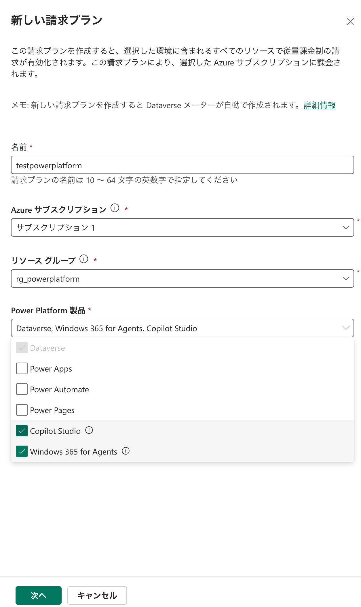 必要項目を入力します。ここでAzureで作成したサブスクリプションとリソースグループを設定します。正しく設定ができていれば、プルダウンメニュー内に表示がされるため、特に迷うことはないはずです。そしてPower Platformの製品を選択します。Dataverseはデフォルトでオンとなっています。また、Copilot Studioを選択すると、Windows 365 for Agentsにも必然的にチェックが入るようになっています。