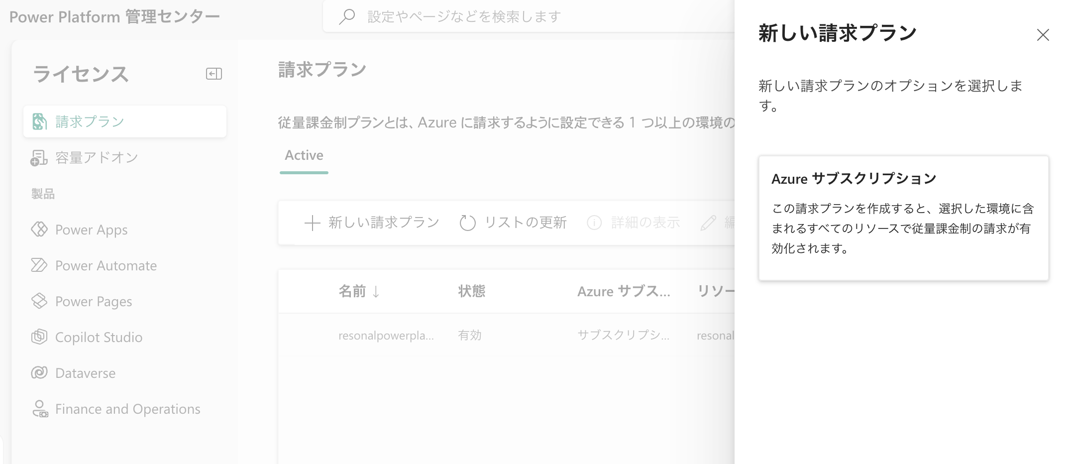 ドロワーが表示され、請求プランとしてAzureのサブスクリプションが選択できるはずです。