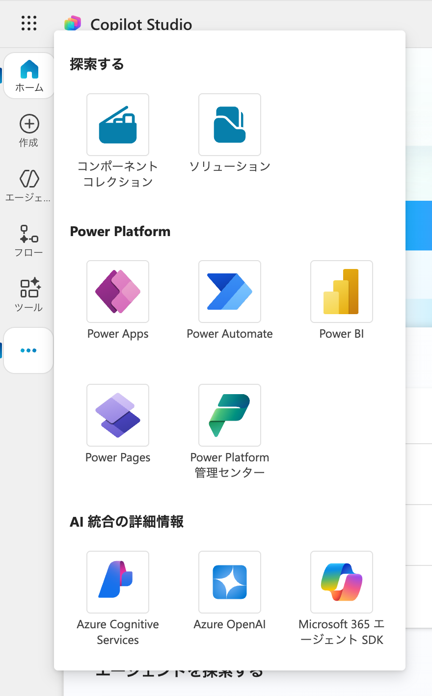 Copilot Studioからの移動の仕方が分からないという方は、Copilot Studioのサイドメニューにある ...からPower Platform管理センターへ移動することができます。