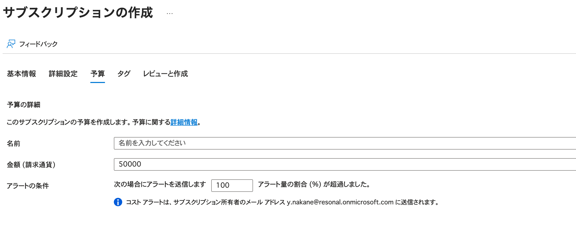 なお、金額が高くなりすぎてしまいそうなのが怖いという方は、予算の設定を設けましょう。予算タブを選択することで、そのサブスクリプションでの予算が指定した金額を超えたらアラートが発生するようにできます。