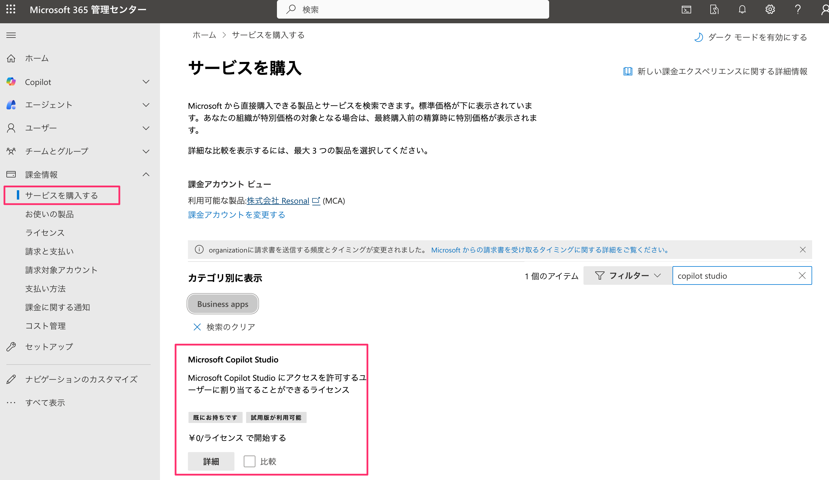 同じように課金情報のセクションから「サービスを購入する」を選択してください。Copilot Studioの製品を表示し、詳細をクリックしてライセンスの付与をするために移動します。
