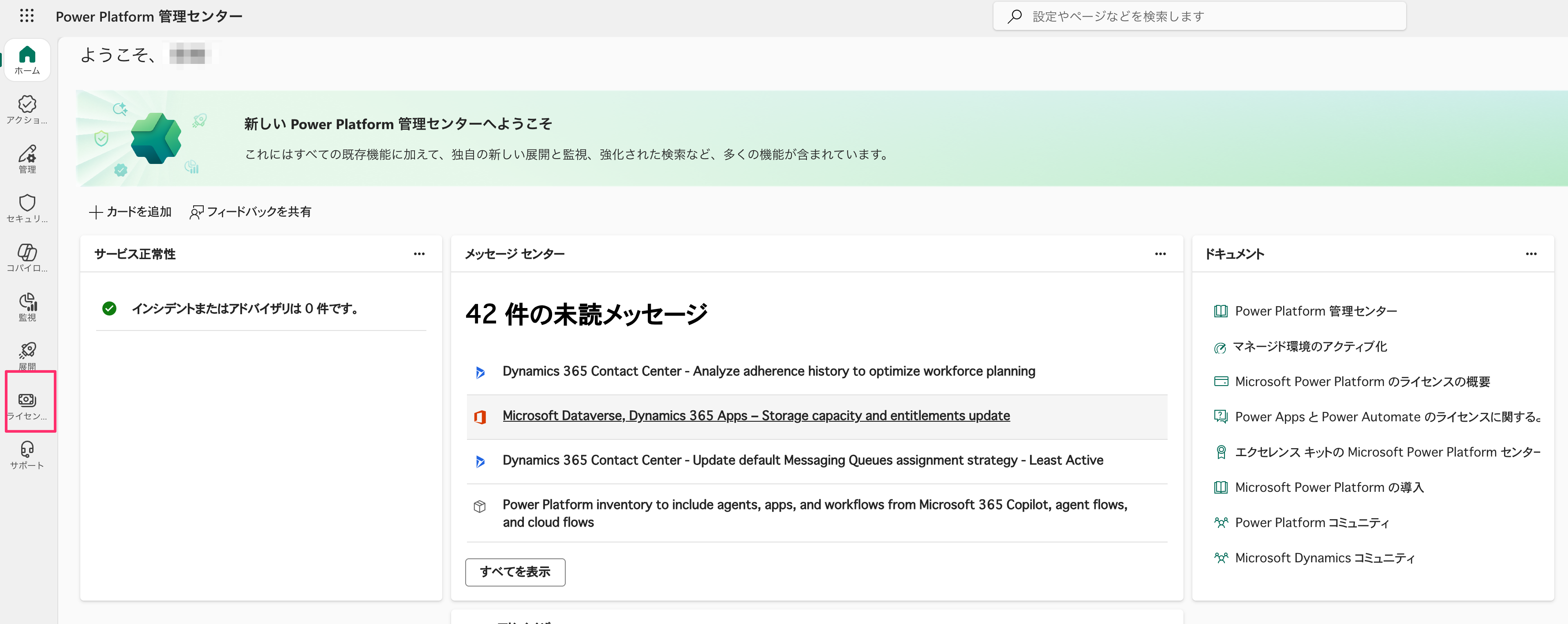 Copilot StudioはPower Platform内の一アプリとして存在しているため、Power Platform管理センターへ移動してください。そしてライセンスを選択してください。
