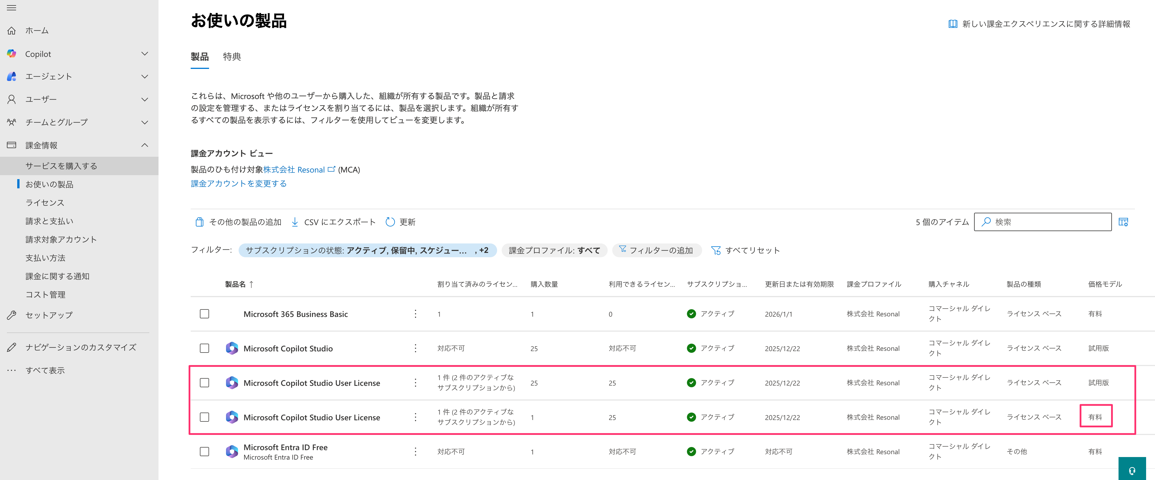 そういった場合はMicrosoft 365の管理センターに移動してください。課金情報の中からまず、「お使いの製品」を選択してください。現在使用している製品の一覧を見ることができます。Copilot Studioには実は2種類のライセンスがあり、 Microsoft Copilot Studio と Microsoft Copilot Studio User Licenseです。前者は テナントライセンスで組織レベルで必要なライセンスであり、組織全体でCopilot Studioを使えるようにするための「土台」となるものです。後者は、エージェントを作成・管理する個々のユーザーに割り当てるもので、エージェントを公開できない場合おそらくこのMicrosoft Copilot Studio User Licenseを持っていない可能性が高いです。弊社もここで公開できずに詰まった経緯があります。
