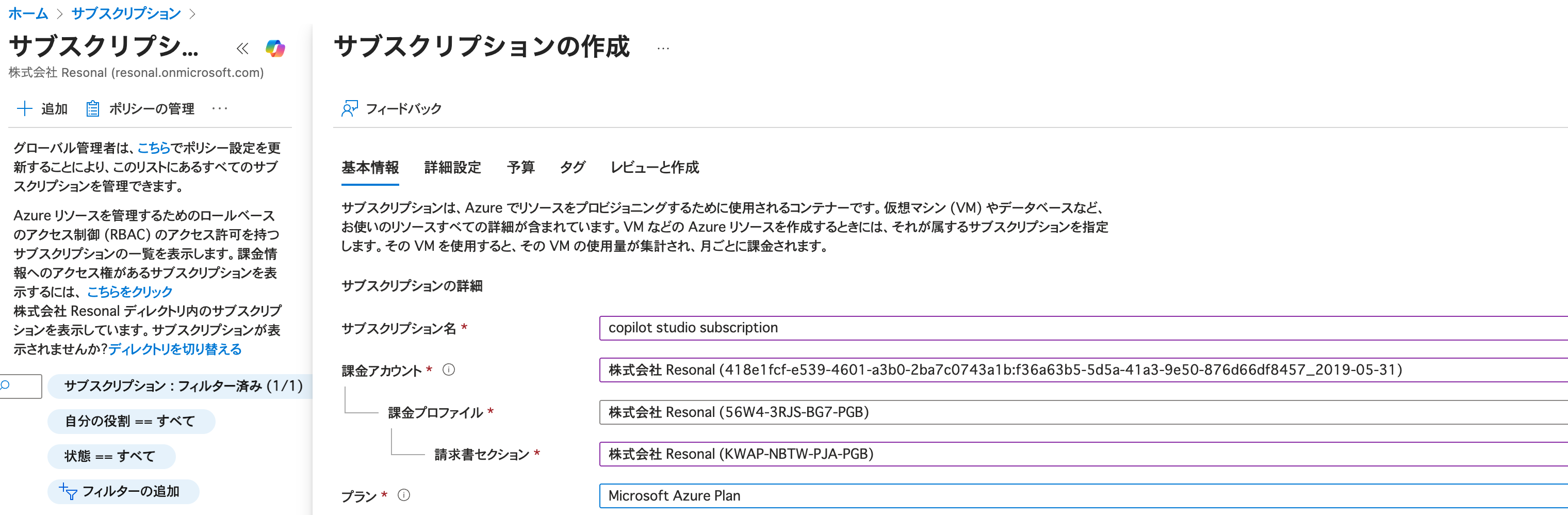 Azureの環境を登録する時に、基本的にサブスクリプションは必須となってくるため、大きくは解説しませんが、適宜課金アカウント、プロファイル、請求書セクションを選択してください。