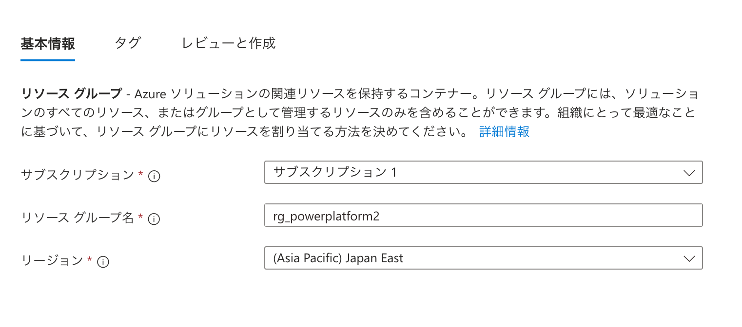 つまり、リソースグループは実際に使うサービスを整理整頓するための入れ物です。プロジェクトごと、環境ごと(開発用・本番用)、部署ごとなど、自由に分類できます。今回はCopilot Studioを含むPower Platformの製品のためのリソースグループとして作成します。