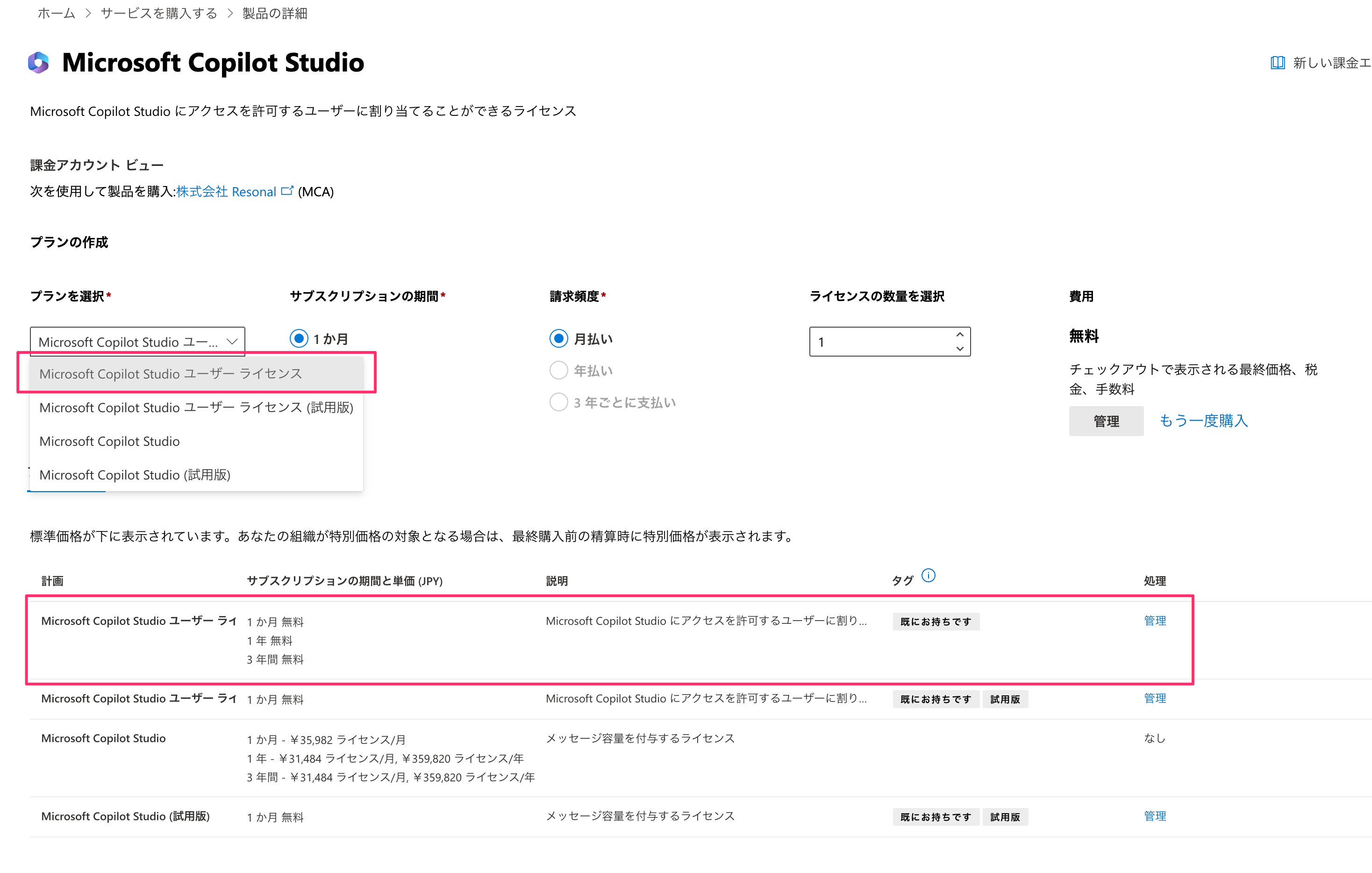 ここで試用版ではないMicrosoft Copilot Studioユーザーライセンスを購入します。Microsoft Copilot Studioユーザーライセンスは画像の通り無料です。試用版のみを申し込んでいるとこのライセンスが付与されておらず、エージェントの公開権限がなく、公開に至れません。